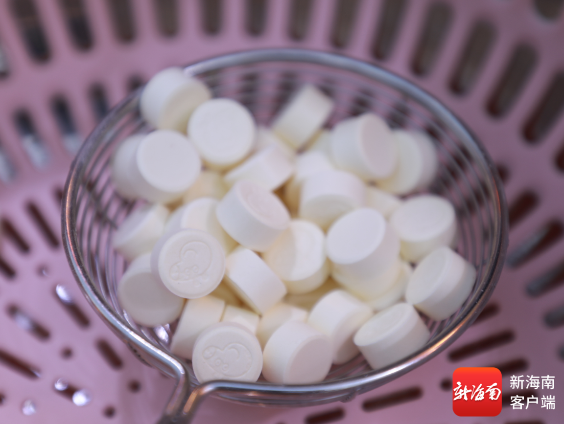 随后,一包包新疆骆驼奶粉被倒入专用的奶贝压缩机中,在机器的细微嗡鸣中,粉状的奶粉在压力效果下“秒”变一颗颗细巧坚实的奶贝。“不到10分钟,一包奶粉就能变成大约200粒奶贝,刚好装满这一罐。”店家一边娴熟操作一边说道。